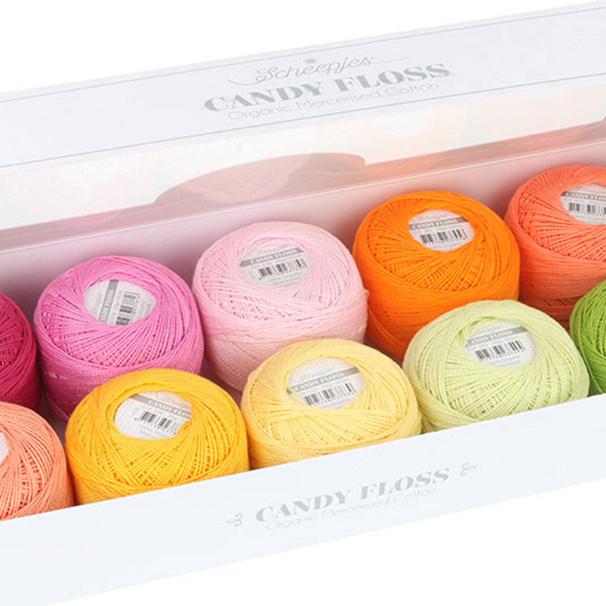 The Scheepjes Candy Floss colour packs are a wonderful gift for any crafter. Each colour pack includes a curated selection of 10 different yarn balls, which are packaged in a beautiful window box, just like small pastries.